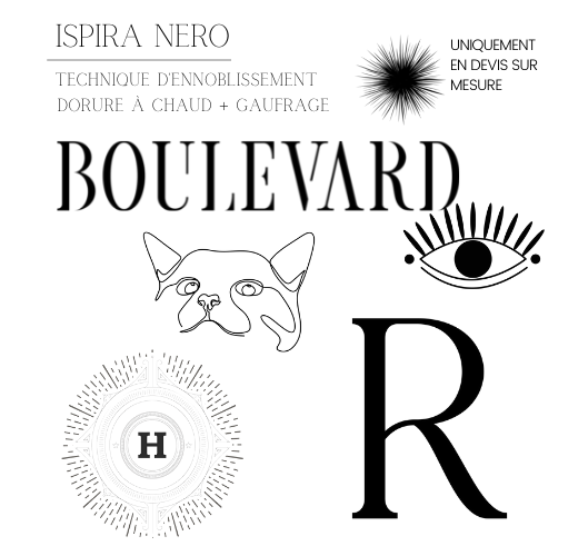 Le papier ispira nero est un support de très haute qualité. En effet, ce dernier étant teinté en noir dans la masse cela lui proccure une dimension premium naturellement. C'est un support qui ne s'adapte pas à tous les visuels car il est impossible d'imprimer des aplats ou des textes de couleurs sur celui-ci. Il est exclusivement réservé aux techniques d'ennoblissement telles que la dorure à chaud ou bien le gaufrage.